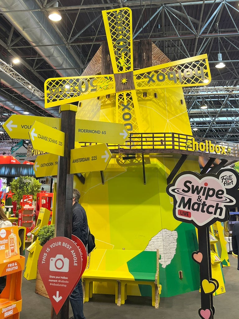 Dazu gehörten interaktive Displays wie Stand-in-Figuren, unser Swipe-&-Match-Panel und die Geschichte von Holbox im Inneren der Mühle. Auch die Re-board-Bäume, Sitzbänke und andere Messemöbel waren Teil des Gesamtkonzepts. Sie waren nicht nur funktional, sondern verstärkten auch die Ausstrahlung und Atmosphäre des Standes.